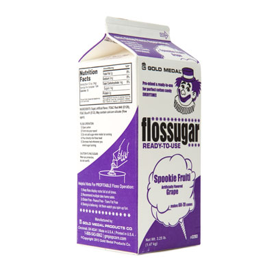 Gör lila sockervadd med smak av vindruva med Flossugar Spookie Fruiti, perfekt till halloweenfesten! Den finkorniga sockervaddsmixen är förpackad i ett smidigt och lätthanterligt TetraPak. Hela paketet räcker till att göra 60-70 färdiga sockervadd! Allt du behöver göra är att öppna förpackningen och hälla sockret direkt i sockervaddsmaskinens spinnarhuvud som du kan fånga upp på en strut eller pinne när sockervadden börjar ta form.